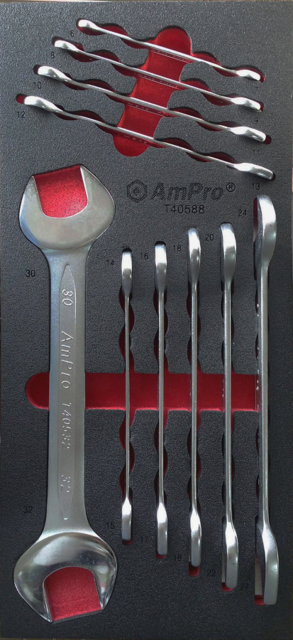 Приобрести T40588 Набор рожковых ключей 6х7-30х32мм,10 пр., в мягком ложементе от компании AmPro (Тайвань) из раздела Ложементы мягкие (VA серия)