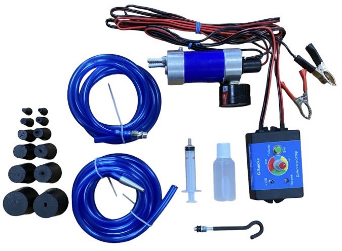 В комплект поставки включены: шприц для дозирования и заправки дымовой жидкости; дымовая жидкость; комплект резиновых конусных пробок. (Размеры пробок для подачи дыма: 5/10; 8/12; 12/18; 17/23; 23/29; 32/38.