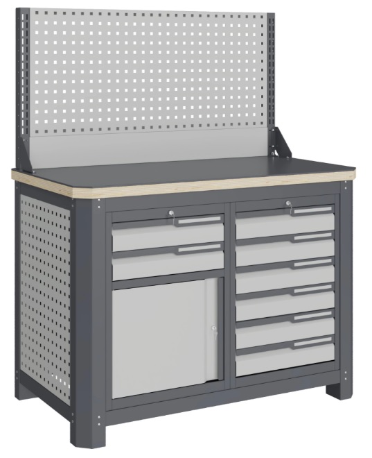 Цвет и текстура покрытия: рамы верстака, накладки столешницы, корпусов модулей RAL 7024 (серый), гладкая, глянцевая; лицевых панелей ящиков и боковых перфопанелей RAL 7047 (серый), гладкая, глянцевая; накладок ручек ящиков RAL 9006 (серый), гладкая, глянцевая.